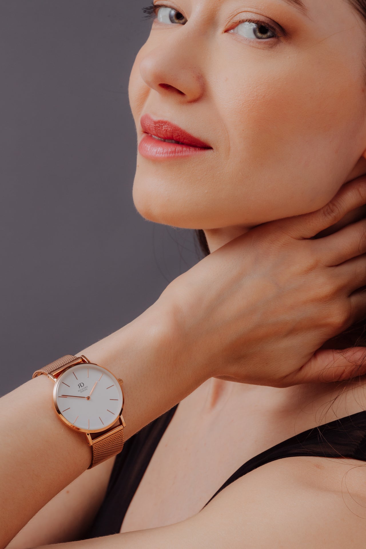 O relógio Classic Mesh Rose Gold White da Richard Dixon é a personificação da elegância e simplicidade. Com uma caixa em aço inoxidável de tonalidade rosa-dourado e mostrador branco minimalista, este acessório destaca-se pela sua versatilidade, complementando qualquer estilo. A bracelete milanesa adiciona sofisticação e conforto, proporcionando um ajuste perfeito ao pulso. Este relógio é mais do que uma peça funcional; é um reflexo de intemporalidade e estilo, ideal para quem valoriza a elegância subtil. Um acessório desenhado para acompanhar os momentos mais marcantes da tua vida.