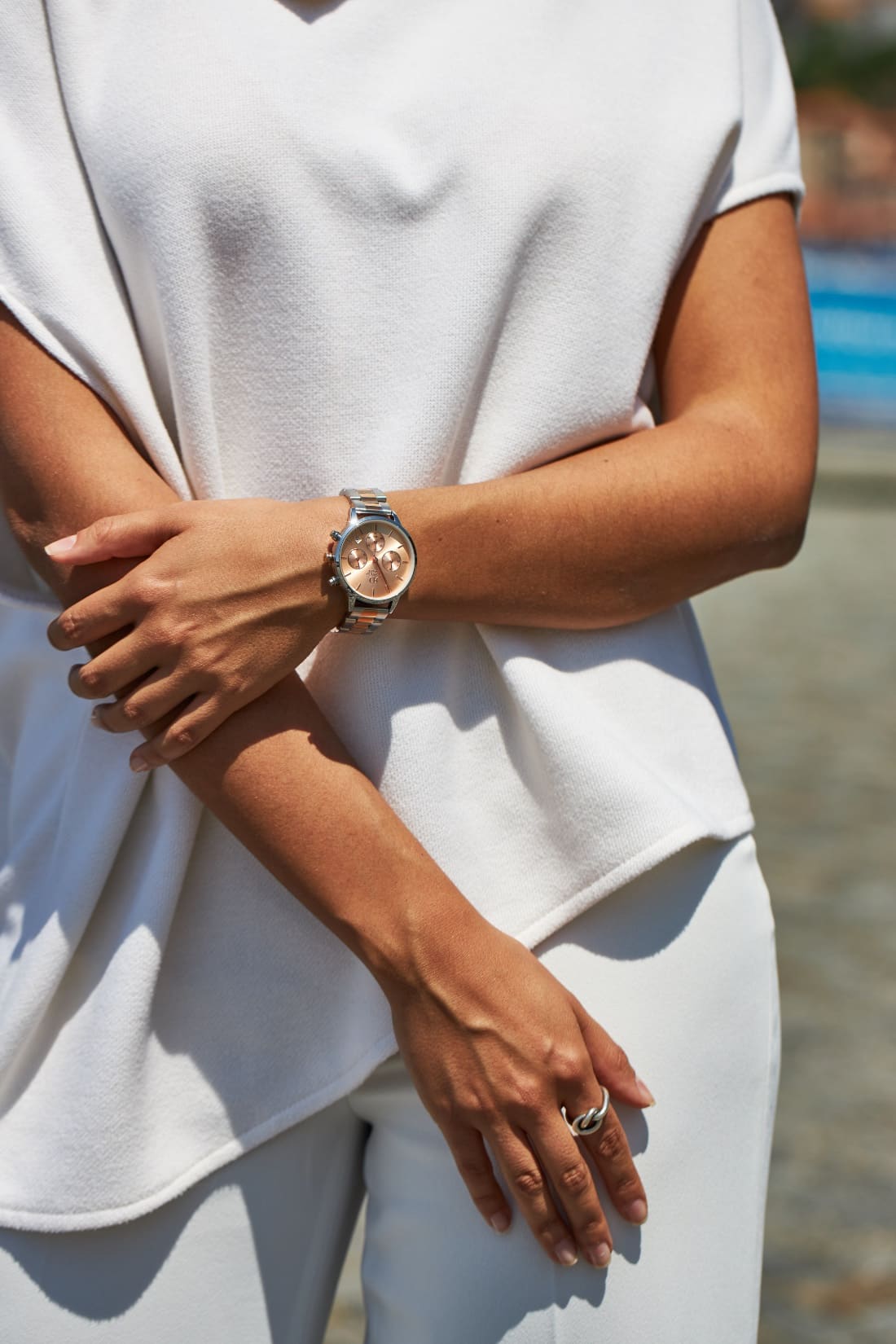 Fabricado com aço inoxidável 316L, o Premium Chrono Steel Silver Rose garante durabilidade e resistência, mantendo o brilho e a qualidade ao longo do tempo. O seu mostrador em rosa-dourado, com ponteiros discretos e funções de cronógrafo, oferece uma leitura precisa e clara. A bracelete em elos metálicos, com acabamento prateado e rosa, complementa perfeitamente o design moderno e sofisticado, proporcionando um encaixe confortável e ajustável ao pulso. Este modelo é ideal para quem procura versatilidade, combinando facilmente com diferentes estilos de vestuário e ocasiões. O vidro em cristal mineral endurecido oferece proteção contra riscos, garantindo que o seu relógio mantém sempre uma aparência impecável. Com um diâmetro de 38 mm, é o acessório perfeito para quem valoriza a combinação de funcionalidade com elegância.